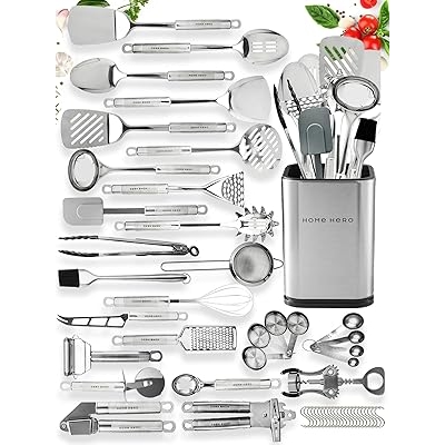 Home Hero 54-Piece Stainless Steel Kitchen Utensils Set - Heat-Resistant Nonstick Silicone & Stainless Steel Cooking Utensils - Complete Tools with Slotted Spoon & Pasta Spoon - Pack of 54, Silver